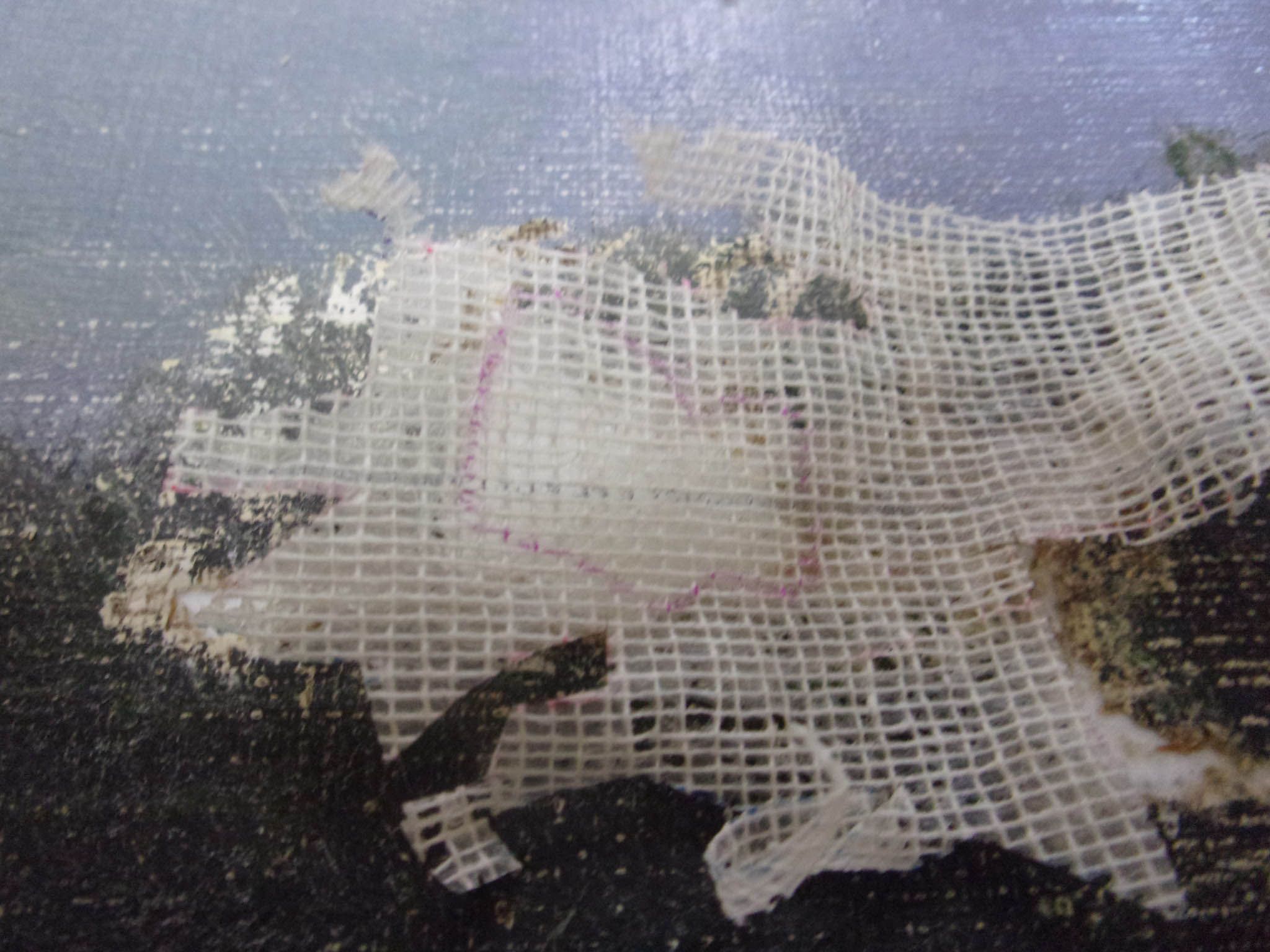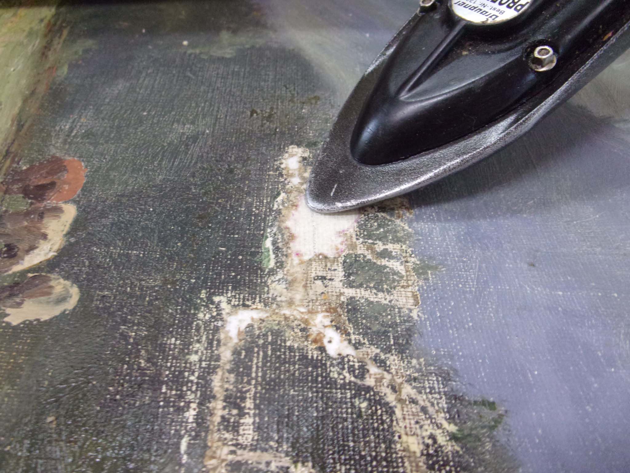 Les petites déchirures se réparent soit par un raccordement des fils s’il n’y a pas de lacune de toile, soit, le plus souvent, par la pose d’une pièce au revers collée à la cire-résine.Dans des cas plus extrêmes, lorsque nous sommes confrontés à des déchirures ou des zones lacunaires plus importantes, ou à un affaiblissement de textile, nous pouvons procéder au rentoilage, qui consiste à coller une toile neuve au dos de la toile originale.